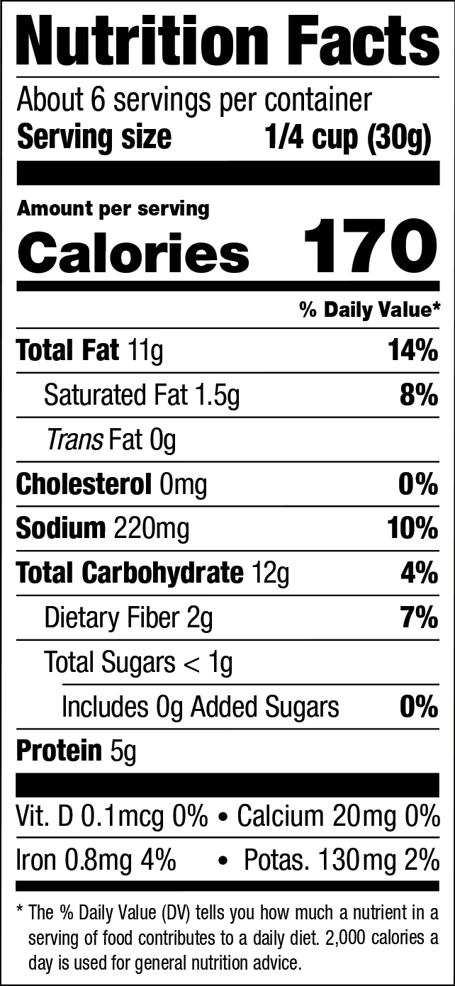 INGREDIENTS: RANCH SEASONED PEANUTS (PEANUTS, SEASONING [BUTTERMILK, SEA SALT, ONION POWDER, GARLIC POWDER, SUGAR, NATURAL FLAVOR, YEAST EXTRACT, LACTIC ACID, CITRIC ACID, ANTI-CAKING AGENTS {SILICON DIOXIDE, CALCIUM STEARATE}], HIGH OLEIC SUNFLOWER OIL), RANCH SEASONED CORN NUGGETS (CORN, HIGH OLEIC OIL [CONTAINS ONE OR MORE OF THE FOLLOWING: CANOLA OIL AND/OR SAFFLOWER OIL], SEASONING [SALT, MALTODEXTRIN, DEHYDRATED GARLIC AND ONION, SUGAR, YEAST EXTRACT, SODIUM DIACETATE, NATURAL AND ARTIFICIAL FLAVOR, TOMATO POWDER, CITRIC ACID, DEHYDRATED BELL PEPPER, PARSLEY, DISODIUM INOSINATE, DISODIUM GUANYLATE, SODIUM DIOXIDE {ANTI-CAKING AGENT}]), GARLIC SESAME STICKS (ENRICHED UNBLEACHED FLOUR [WHEAT FLOUR, MALTED BARLEY FLOUR, NIACIN, REDUCED IRON, THIAMIN MONONITRATE, RIBOFLAVIN, FOLIC ACID], SOYBEAN OIL, SESAME SEEDS, BULGUR WHEAT, GARLIC POWDER, BEET POWDER [COLOR], TURMERIC [COLOR]), ROASTED CASHEWS (CASHEWS, CANOLA OIL, SALT), PUMPKIN SEEDS.